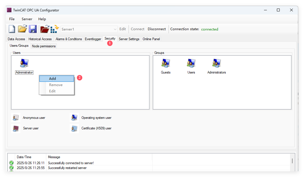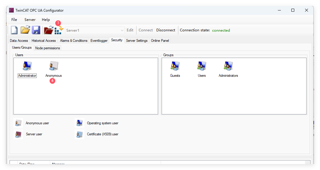 7、点击Activate on target按钮,即可将该配置激活到OPC UA Server中。Server重启生效后,client即可通过匿名方式访问Server的数据。