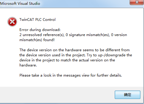 该报错是因为编程电脑上使用的TwinCAT 3软件版本与PLC上的TwinCAT 3版本不一致