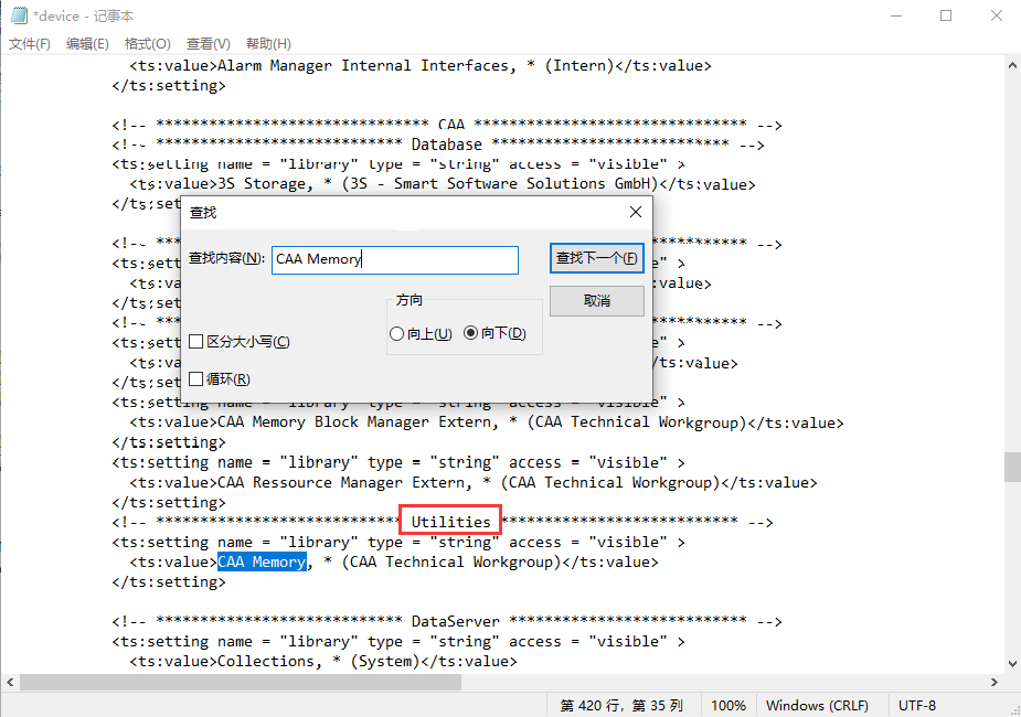 以记事本方式打开其中的device.XML文件,之后按CTRL+F组合键搜索CAA Memory。找到位于Utilities类目下的CAA Memory