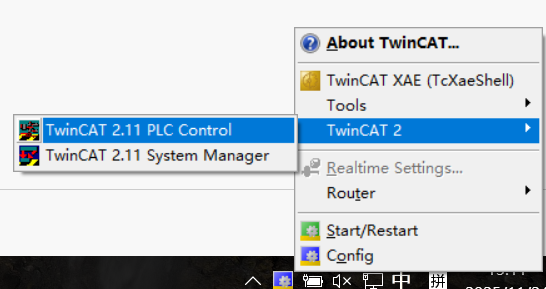 5.待安装完毕后,可以点击系统任务栏中的TwinCAT图标,进入TwinCAT 2,选择PLC Control和System Manager打开即可