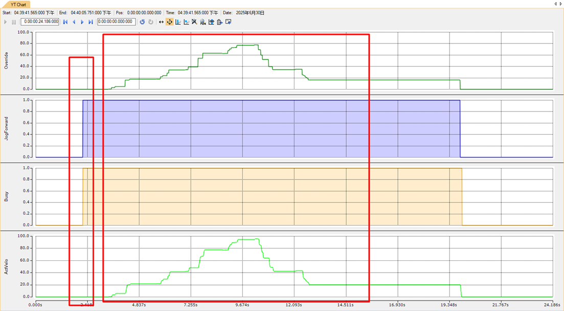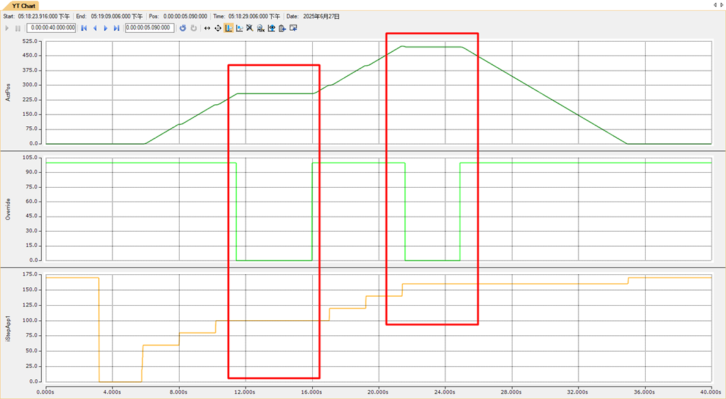 此应用说明,当Override为0时触发轴动作并不会导致轴动作报警,并在Override恢复后可以接着完成动作指令。