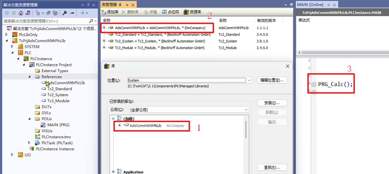 2.在PLC工程中,安装库文件→添加库到项目→Main程序中调用运算函数;