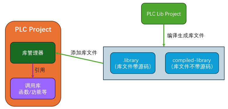 在项目开发过程中为满足核心算法的保密要求,可以将实现核心算法部分的PLC代码单独封装为一个编译打包的PLC库文件,在逻辑控制的主程序中仅需调用该算法库中的函数、功能块或程序段即可,以此实现对知识产权的保护。