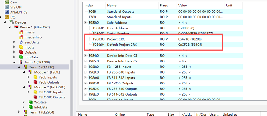可以通过查看F980:03/04这两项,如果F980:04表示EL1918模块在出厂状态下(未下载过安全程序)的默认CRC,如果F980:03与该值不一致,则说明这块EL1918有下载过安全程序