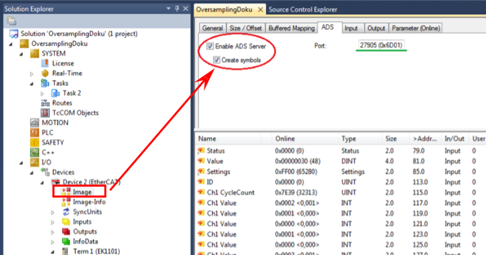 进入模块所在的EtherCAT Device→Image→ADS,勾选Enable ADS Server和Create symbols,并记录下Port