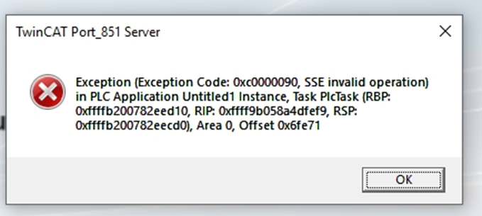 当使用REAL_TO_INT或LREAL_TO_INT时,要确保被强制转换的值小于263(当然,REAL严格意义上的范围是232),否则控制器的TwinCAT 3内核服务会出错停止,并伴随Exception的报错: