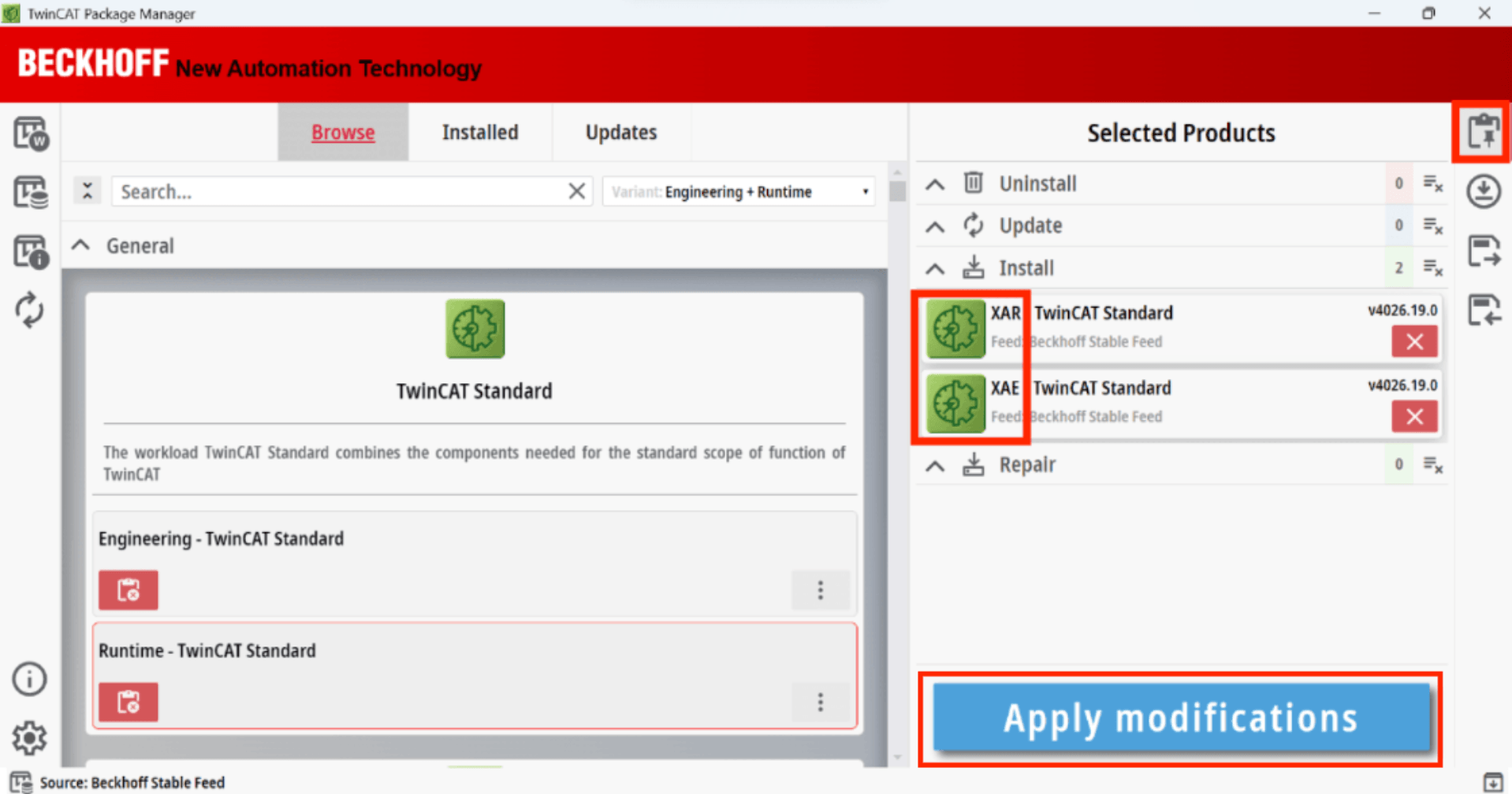 2. 在界面右边可以查看所要安装的工作负载信息,Runtime就是XAR,Engineering就是XAE,之后点击Apply modifications按钮;
