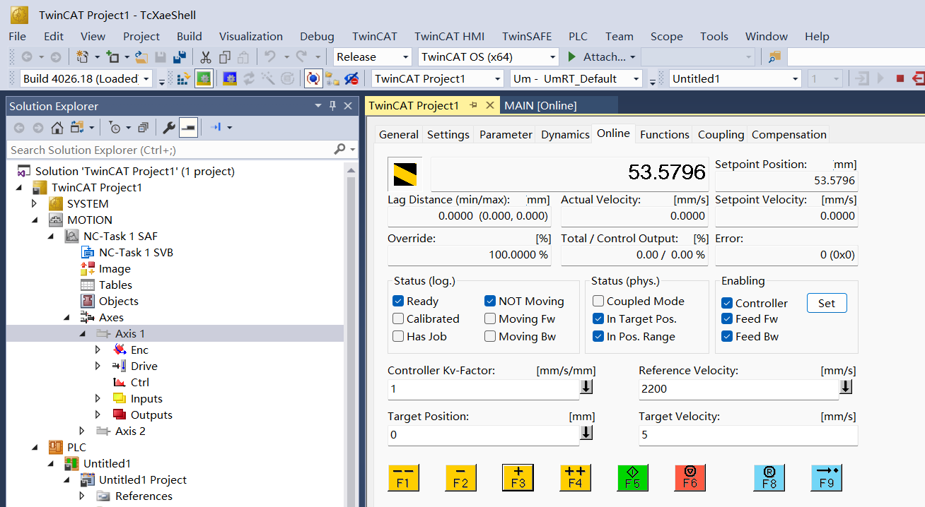 手动创建NC轴,并按照第2~4步的操作重新激活TwinCAT。之后就能调试虚轴了,包括使能、点动、耦合等功能都是支持的,也可以编写运动控制程序运行。